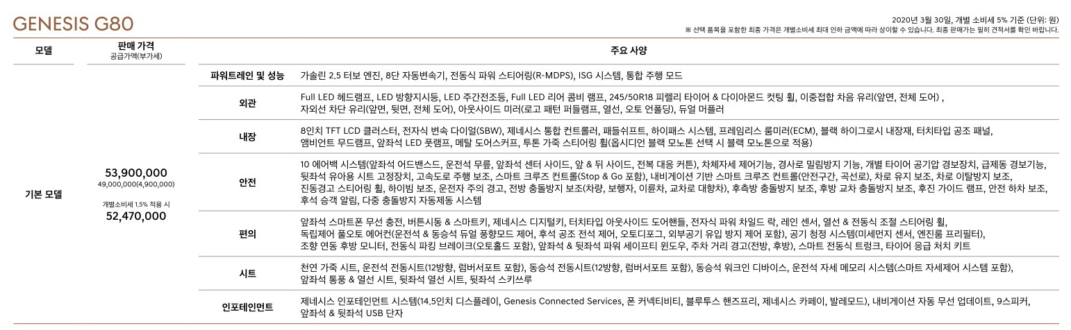 신차는 디자인 면에서도 세련됐지만 여러 새로운 기능들을 이용할 수 있습니다. 대표적으로 G80의 주요사양과 가격은 아래와 같습니다.
