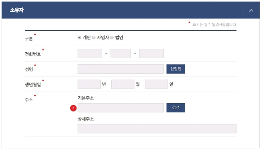 3) 신청인 버튼을 클릭하여 기본정보를 자동입력