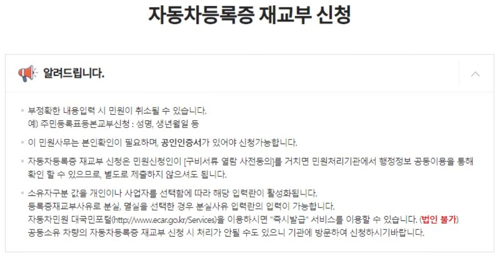 또한 차량이 공동소유인 경우에는 재교부신청이 안될 수 있으니 오프라인으로 방문하여 신청하시기 바랍니다.
