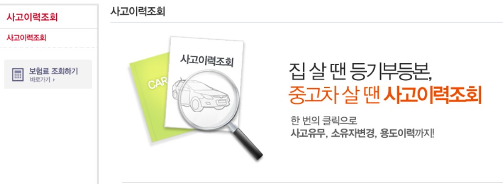 그 다음으로 확인 가능한 기능은 사고 이력 진단입니다. SK 엔카에서 사고이력 메뉴 조회를 이용하면 중고차에 대해서 확인할 수 있는 방법이 나와 있습니다.