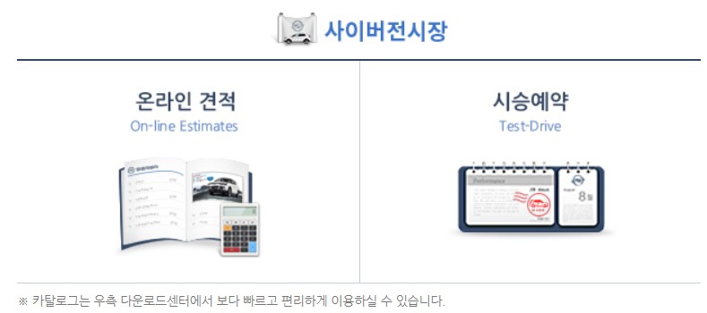 카탈로그로 알아보기 위해서는 먼저 온라인 견적과 시승 예약을 선택하려던 화면으로 가야 합니다.