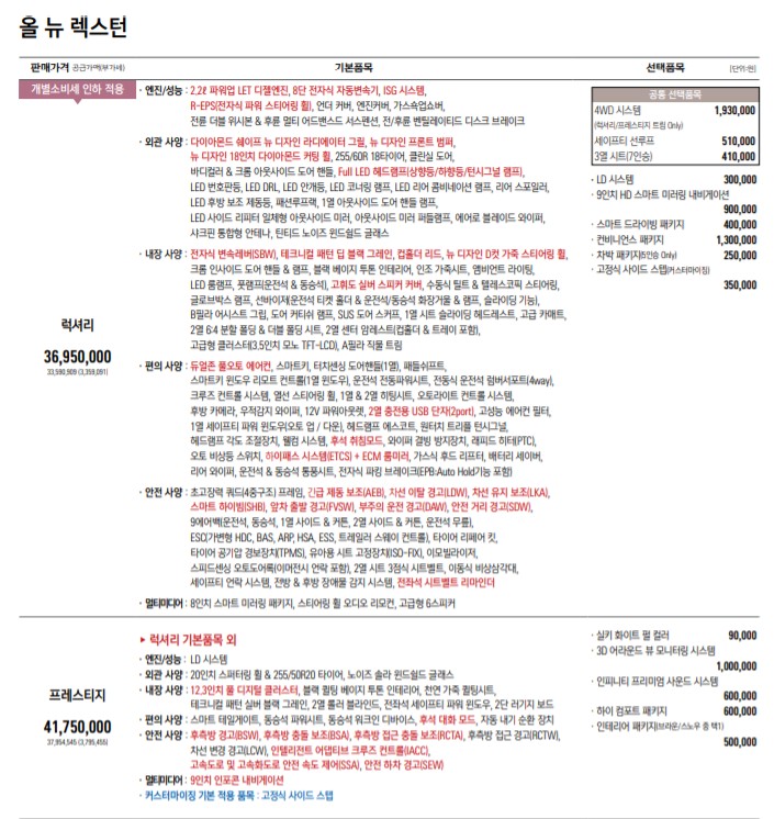 올 뉴 렉스턴의 경우 럭셔리와 프레스티지 모델이 있으며, 우측 선택 품목에는 스마트 미러링 내비게이션, 스마트드라이빙패키지, 차박 패키지 등 옵션에 따른 금액을 확인할 수 있습니다.