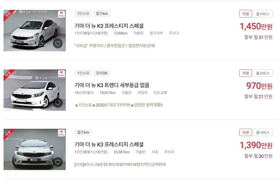 K3의 경우 매물이 꽤 많아서 가격대도 적당하게 형성되어 있습니다. 지금까지 나온 모델도 많기 때문에 가격대에 따라서 다양한 모델을 선택할 수도 있습니다.