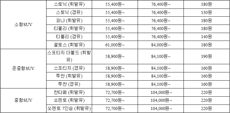 다음은 소형, 준중형, 중형 SUV 입니다. SUV의 경우 휘발유나 경유에 따른 대여비용의 차이는 없구요, 1km당 주행요금이 경유가 조금 더 저렴합니다.
