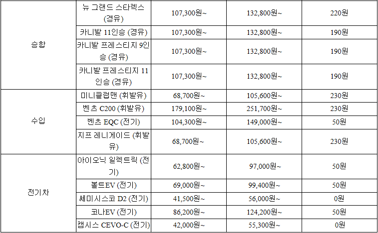 다음은 승합, 수입, 전기차들입니다. 수입차도 생각보다 저렴한 차들도 있구요, 전기차는 1km당 주행요금이 0원인 것도 있지만 약간의 돈이 필요한 차량도 있습니다. 이 점을 잘 보셔야 되겠네요.