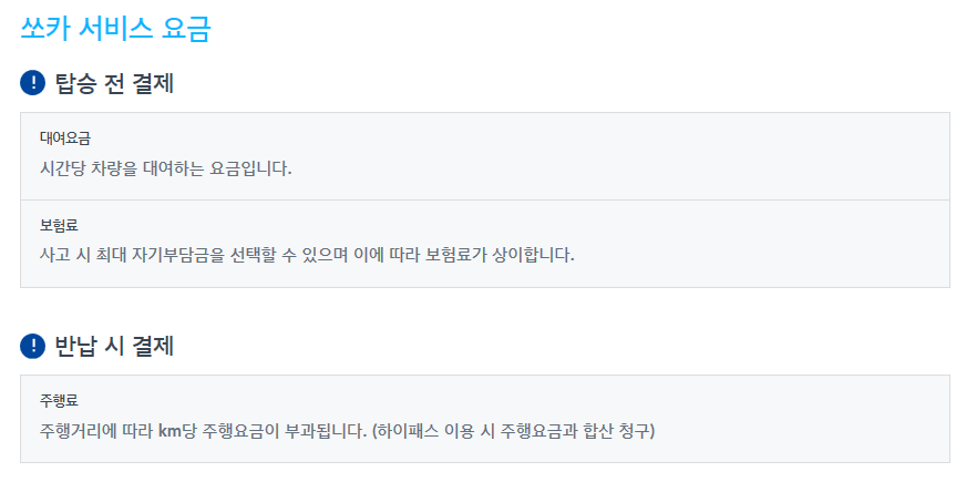 쏘카는 탑승전에 대여요금과 보험료를 내야 하며, 반납할 때는 주행거리에 따른 주행료를 내야 합니다. 하이패스를 이용하셨다면 하이패스 요금과 주행요금이 합산되어 청구되니 이점 참고하세요.